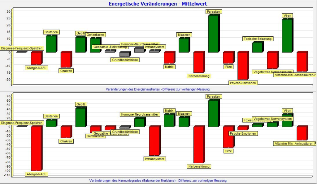 Die Zielgerichtete Evaluation (Aus- und Bewertung) durch Austestung von 19 Ursachenkategorien wie Mikroorganismen (z. B. Pilze, Viren, Bakterien, Parasiten, etc.), toxische Belastungen, Geopathie / Elektrosmog, Narbenstörungen, Gebiss, Psyche/Emotionen, Gehirnkerne, Miasmen, Chakren, Hormone/Neurotransmitter, Vitamine/Mineralien/Aminosäuren/Fettsäuren, Matrix/Bindegewebe, Allergien, Immunsystem, Autonomes Nervensystem in digitaler Form über Kopfhörer mittels Messungen an den Händen und Füßen. Therapieempfehlungen durch Auswahl der geeigneten Mittel/Präparate mittels zielgerichteter Austestung von etwa 240 sehr wirksamen Therapiemitteln in digitaler Form über den Kopfhörer.